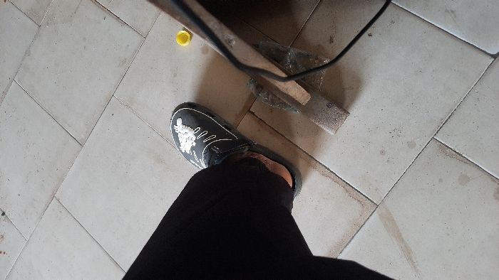 The image captures a high-angle view of a light-colored tiled floor, presumed to be located in Ihiagwa, Nigeria. The scene features the lower portion of an individual's left leg and foot, positioned towards the left of the frame. The leg is clothed in black trousers, and the foot wears a black slip-on shoe with white decorative stitching resembling laces and a white sheep or lamb emblem on the top. The person's bare heel is visible within the shoe. The floor tiles are light grey or off-white, exhibiting visible grout lines, scattered dirt, dust particles, and several dark stains. To the right of the foot, a bright yellow plastic bottle cap lies on the tile surface. Further right, a dark, angled object, possibly constructed from metal or wood, is partially visible, appearing to rest on a transparent material. A black cable extends from behind this object towards the bottom right corner of the frame.
