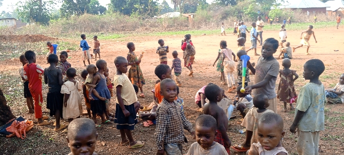 The image depicts an outdoor scene in Konongo, Democratic Republic of the Congo, featuring approximately 30-40 individuals, primarily children ranging from toddlers to pre-teens
