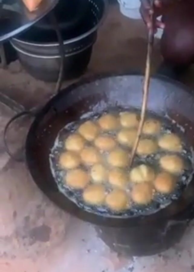 A person is seen frying small, round pieces of dough in a large, black, wok-like pan filled with oil. The pan is sitting on a dark stove. A wooden stick is used to gently stir and turn the dough, ensuring even cooking. Several other cooking implements are nearby, including pots, a colander, and white buckets. The floor appears to be made of reddish-brown dirt or clay.