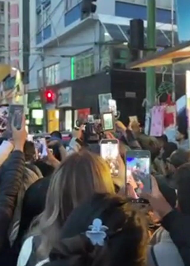 A medium shot shows a crowd of people standing outdoors at a city intersection. Most of the people are holding up their phones to record something. A few of them are using DSLR cameras. A red traffic light is visible. A tall building stands in the background, painted in light blue and white. Street vendor stalls are nearby. The sky is overcast.