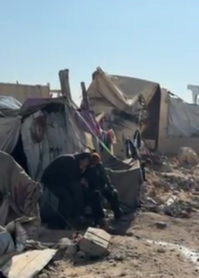 two people embracing in a desolate setting. One person is wearing a black coat and the other is wearing a dark outfit with a reddish head covering. They are surrounded by what appears to be a makeshift camp or settlement, with rough shelters constructed from fabric and debris. The ground is littered with rubble and waste. In the distance, more structures can be seen under a clear, bright sky. The overall atmosphere suggests a scene of displacement and hardship.