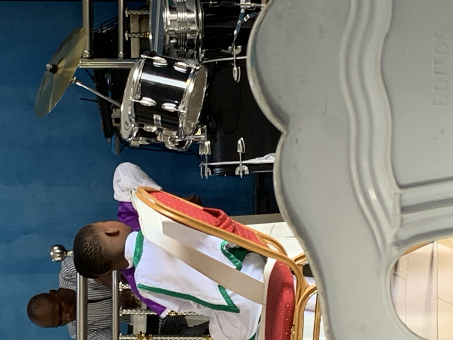 young boy in a white and green robe, sitting on a red and gold chair, facing a drum set. He is looking to the right. A man in a striped shirt is sitting behind the boy, out of focus. The drum set is partially obscured by a white chair. The location is Umuola, Nigeria, at latitude 4.878 and longitude 7.025.