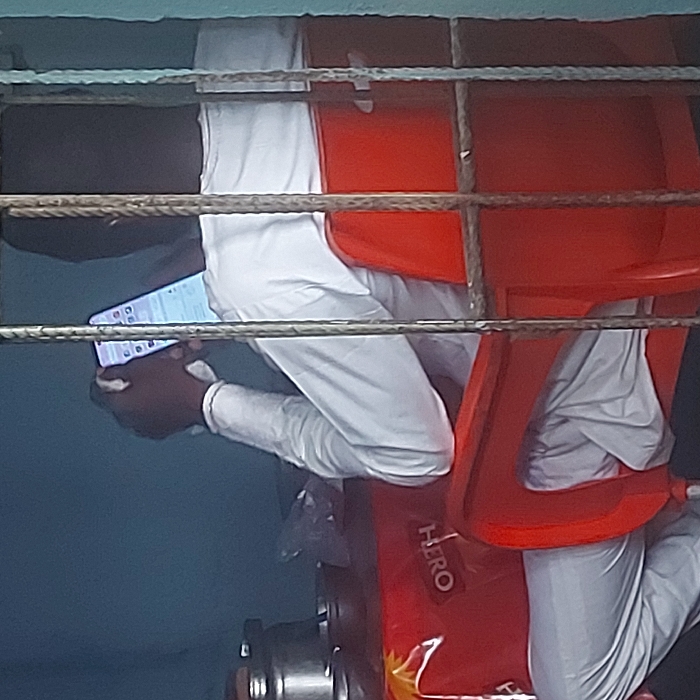 In Shendam, Nigeria, an individual is seated indoors, viewed from the rear-right. The person, appearing male and of dark complexion, wears a white long-sleeved top and white trousers. They are seated on a bright orange plastic chair, actively holding and viewing a smartphone, its screen illuminated with visible icons. To the left, on a dark surface, are multiple metallic containers and a clear plastic bag. A red object bearing the upside-down word 'HERO' is situated below this surface. The immediate background is a plain blue-teal wall. The scene is partially framed by vertical and horizontal metal bars in the foreground, consistent with a window or door grille.