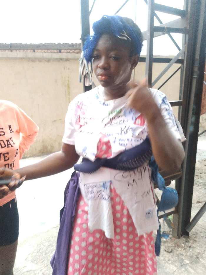 The scene is an outdoor paved area in Unknown, Unknown, illuminated by diffused daylight. Two individuals are present. The primary subject, an adult female with dark skin, stands in the center-right foreground. Her dark hair is styled with a blue mesh material secured by white clips. White powdery residue is visible on her cheeks and forehead. She wears a white short-sleeved t-shirt adorned with extensive handwritten messages and drawings in various colors (black, red, green), and appears to have sections cut or torn. A dark blue textured fabric item is draped across her chest, and a purple fabric piece is draped over her left shoulder. She also wears a pink skirt with white polka dots. Her right hand is raised, forming a gesture with her thumb extended upward and fingers partially curled. Her gaze is directed slightly to her left, not at the camera. A second person, partially visible on the far left, wears an orange long-sleeved shirt with partial black lettering ("S A DAY WE A") and black shorts. This individual holds a dark-colored smartphone in their right hand, extended towards the primary subject. The immediate background consists of a light-colored building wall topped with a dark, ridged coping or roofline. To the right, a dark metallic structural frame, possibly scaffolding, is visible, from which a blue bra and other fabric items are hanging. The ground is a light-colored, uneven paved surface.