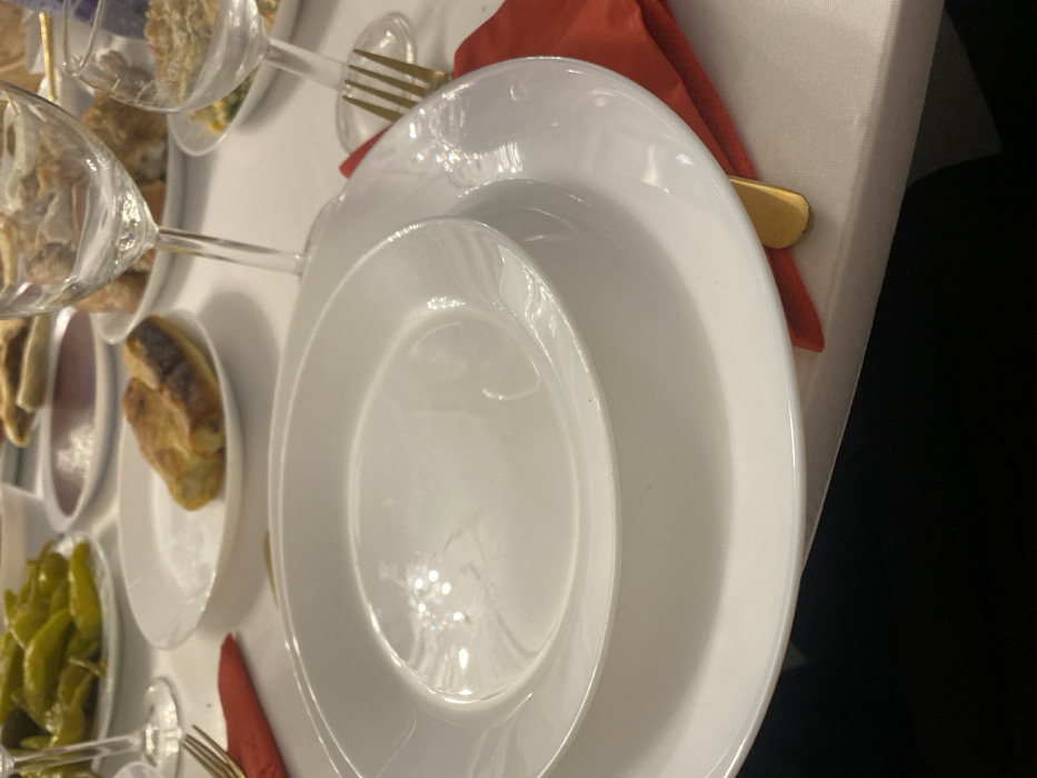 This image depicts a laid dining table in an indoor setting, likely a restaurant or banquet hall. No specific location within Strasbourg, France, is discernible from the visual information provided. In the immediate foreground, a place setting features two stacked white ceramic plates: a larger dinner plate serving as a base, topped by a slightly smaller, shallower white bowl or salad plate. To the right of these plates, a red folded napkin partially obscures a gold-colored fork, with only its handle and tines visible. Another gold-colored fork is visible on the far left of the frame, resting near another red napkin, out of focus. Further into the background, the table is covered with a white tablecloth, reflecting ambient light. Multiple dishes containing food are visible, though somewhat out of focus. On the far left, a white plate holds a pile of green pickled peppers. Adjacent to this, another white plate contains a golden-brown pastry, possibly a borek or similar baked good. A dark, possibly red or brown, circular dish is also present. Two clear stemmed wine glasses stand on the table to the right, one partially filled and reflecting light, the other appearing to contain a mixed food item like a salad. Additional plates with various food items and what appears to be bread are scattered across the table. No individuals are visible in the scene.