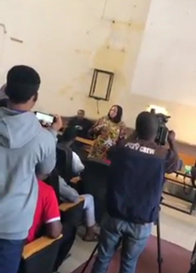 woman giving a presentation or speech in a classroom setting. The classroom has rows of chairs occupied by attendees. A cameraman is filming the woman, and another person is recording with their phone. The woman is wearing a colorful dress and speaking to the audience. The cameraman is wearing a dark blue shirt with "PEY CREW" written on it. Some audience members are casually dressed, while others wear more formal attire. The classroom appears to be a bit worn, with some discoloration on the walls. There are windows in the back, and a fan is visible.
