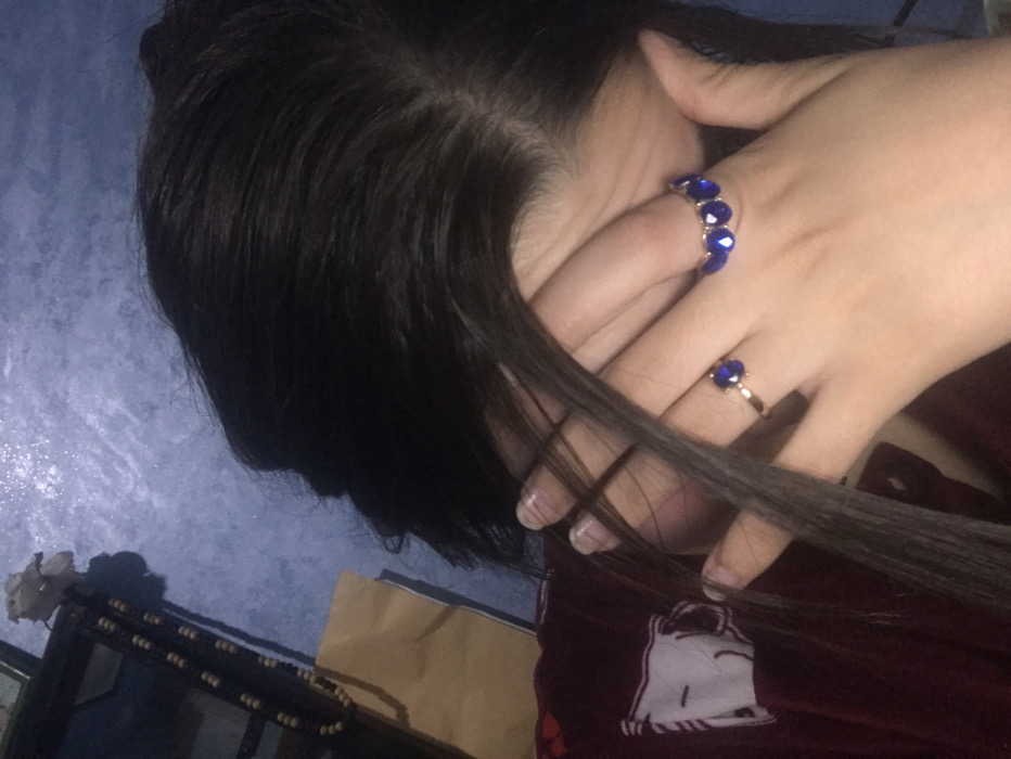 A person with long, dark hair covers their face with their hands. They wear a blue stone ring on their ring finger and a blue stone bracelet. The person is dressed in red attire with a small white cartoon image near the shoulder area. A bedside table or dresser is visible at the bottom left of the frame with items partially obscured. The background includes a blue wall.