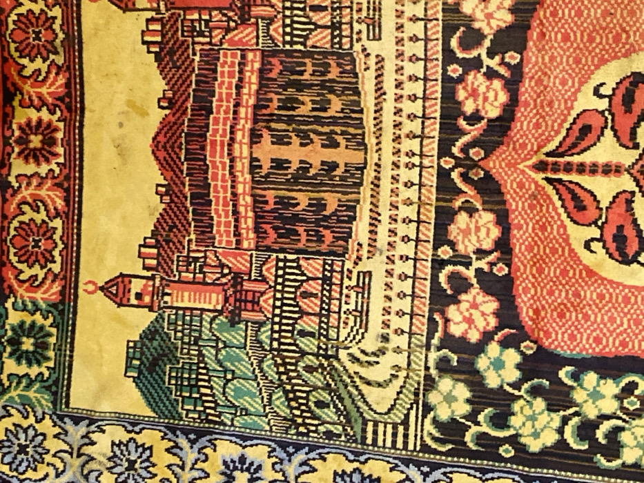 The image displays a woven textile, likely a prayer rug, depicting a stylized urban landscape