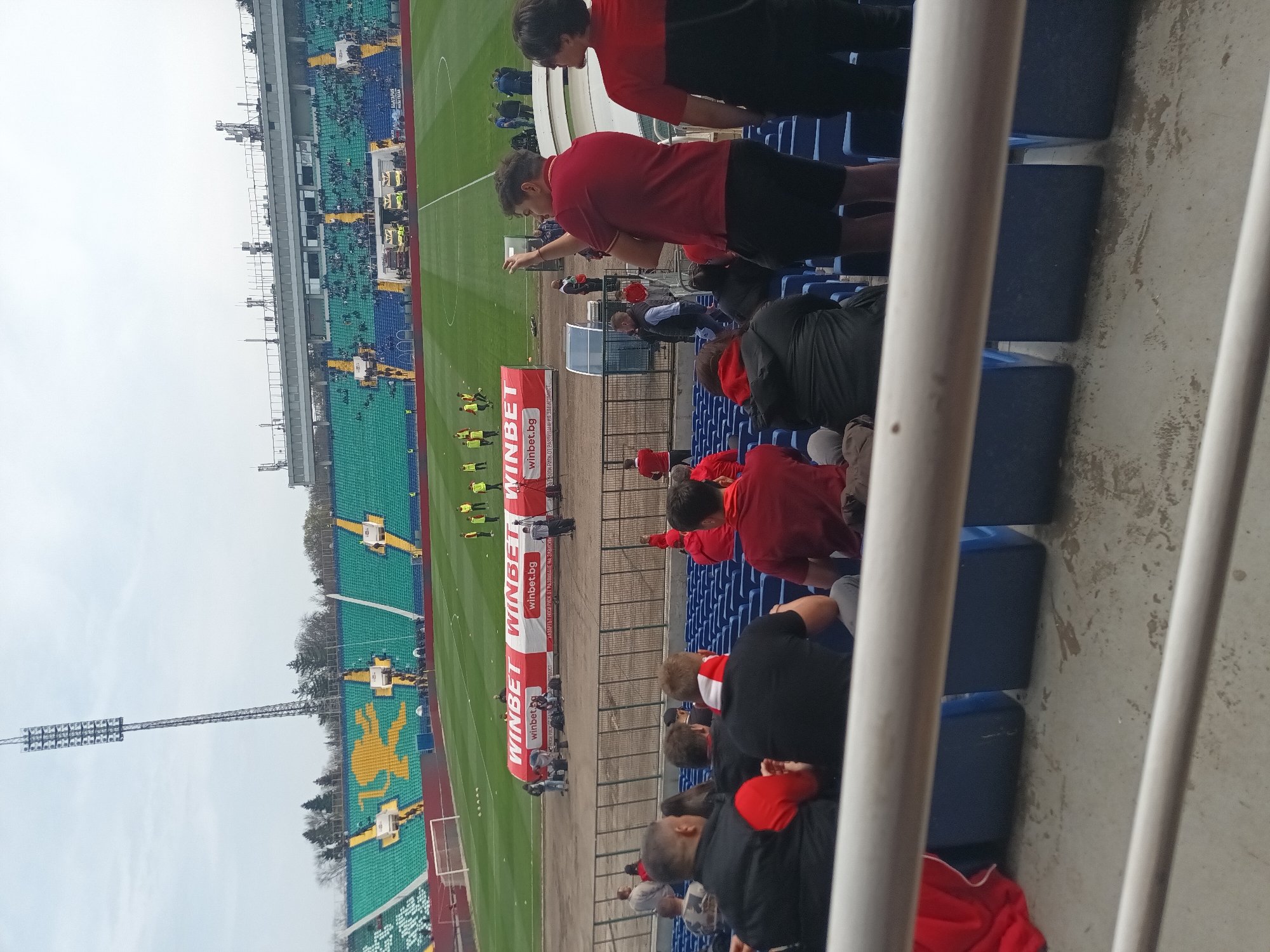 A medium-shot, portrait photograph shows a soccer match at a stadium in Sofia, Bulgaria
