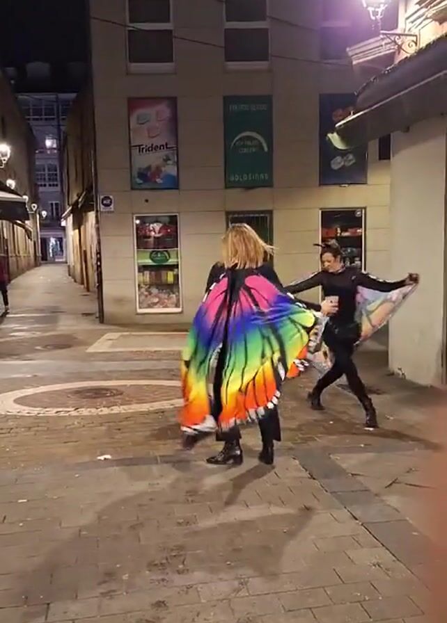 Two people dressed in butterfly costumes dance on a cobblestone street at night. They both wear dark clothing and have large, colorful butterfly wings. The person on the left has blonde hair and wears a pair of butterfly antennae. The person on the right has dark hair and a small bag over their shoulder. Behind them, a building with multiple windows and advertisements is visible. Streetlights illuminate the scene.