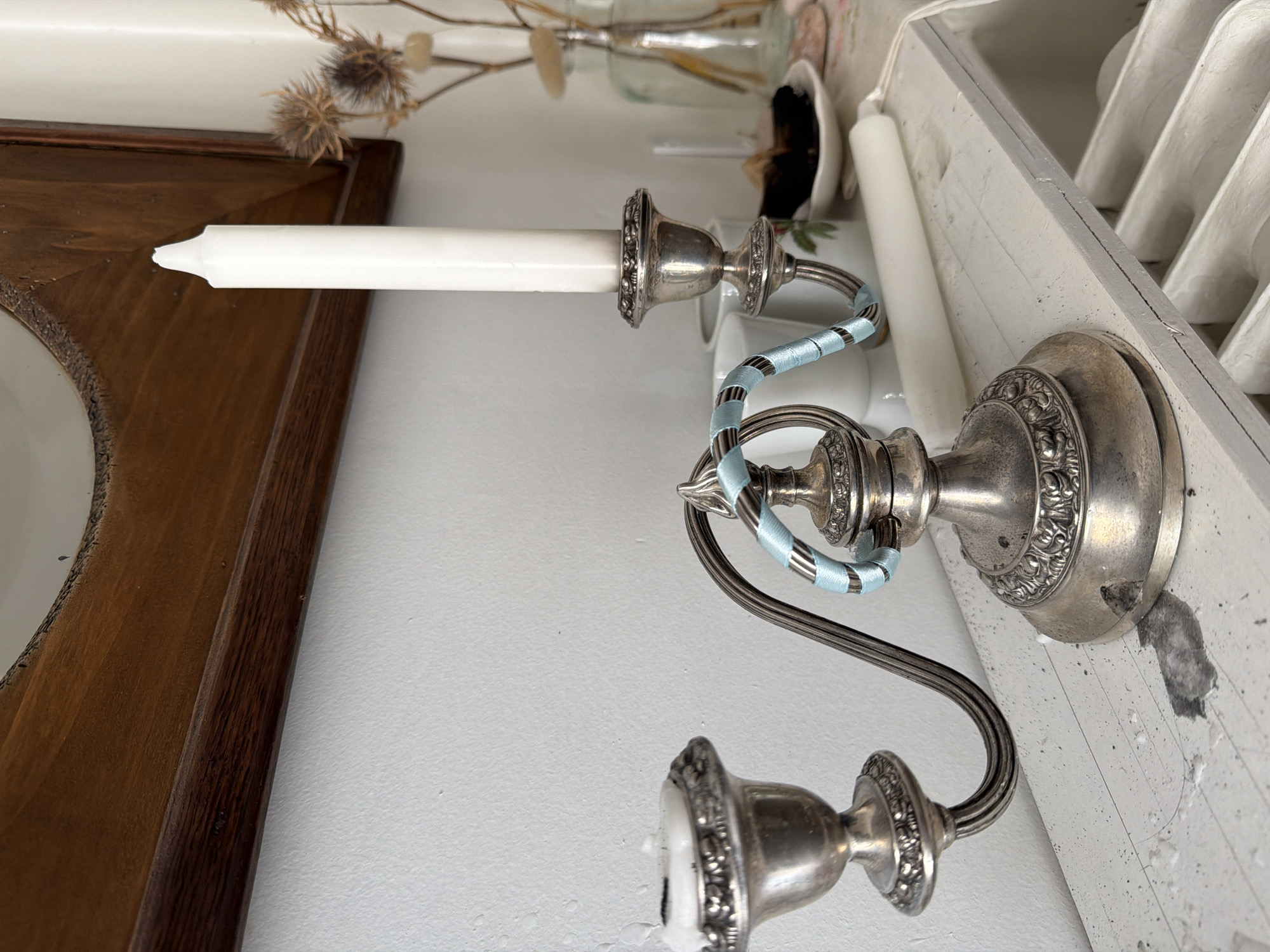 three-candle silver candelabra with white candles placed on a white surface adjacent to a wooden-framed object. The candelabra has a light blue decorative band wrapped around its central arm. In the background are dried flowers in a vase and what appears to be a white radiator. The location in the city of Aubervilliers, France is not discernible from the image alone.