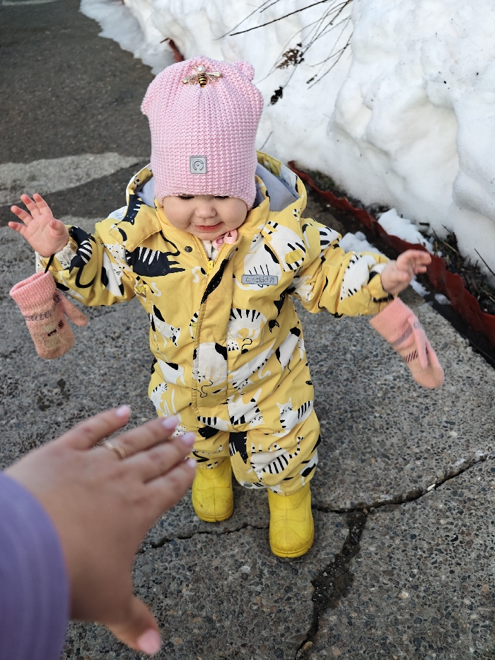 This image, captured in the city of Chaikovsky, Russia, depicts an outdoor scene focusing on an infant and a partially visible adult. The infant, positioned centrally, is standing on a cracked dark gray asphalt or concrete surface. The infant is dressed in a yellow full-body snowsuit patterned with black and white stylized cats, yellow boots, and a pink knitted hat adorned with a gold-colored bee embellishment on the front and a small gray rectangular tag. Pink knitted mittens are suspended from strings attached to the snowsuit sleeves, not worn on the infant's hands. The infant's arms are raised slightly with open palms, and a faint smile is visible. In the foreground, the extended right hand and forearm of an adult, wearing a purple sleeve, reach towards the infant. A gold-colored band is visible on the adult's ring finger. To the right and behind the infant, a bank of dirty, melting snow is present, bordered by a reddish-brown strip of material at its base.