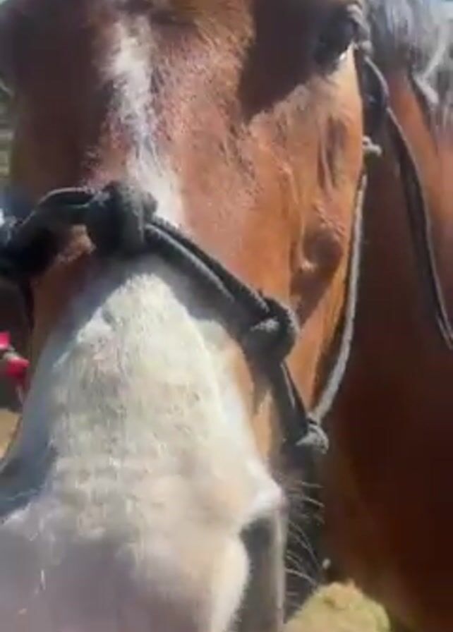 close-up of a brown horse with a white blaze eating green grass through a fence. The horse is wearing a rope halter and a saddle. The environment appears to be a horse pen with a green sun shade in the background. The sky is blue. The camera initially focuses on the horse's face, then pulls back to show its body and saddle.