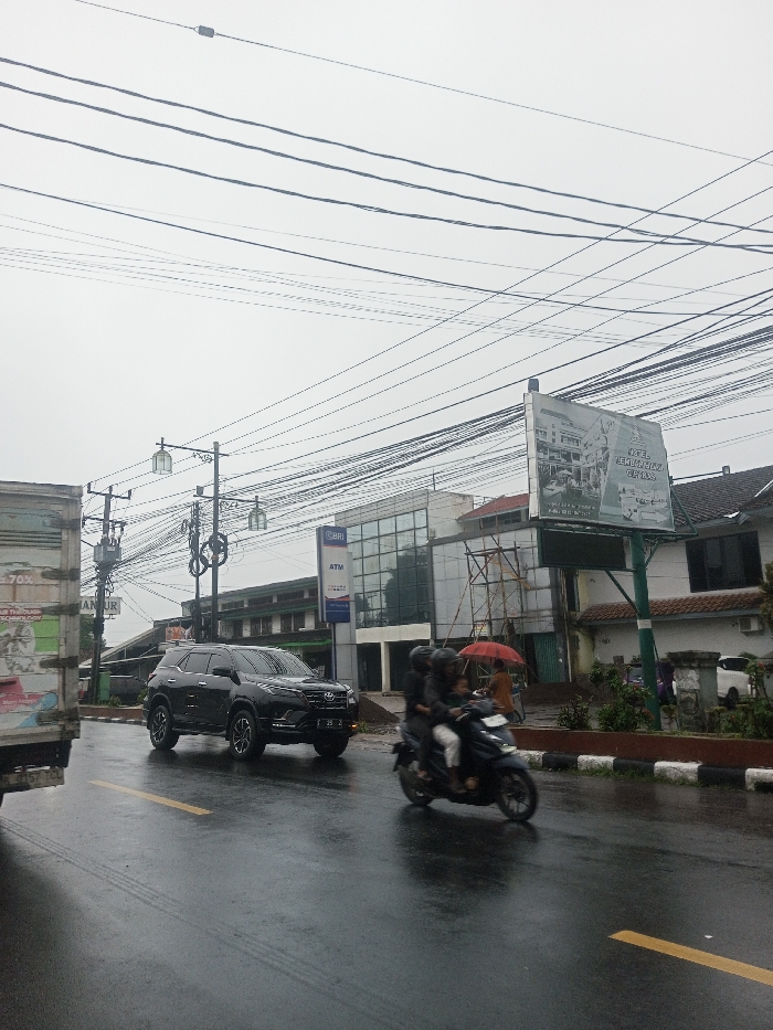 The scene depicts a wet urban street in Babaliya Mal., India, under an overcast sky, suggesting recent rainfall. A dark-colored Toyota Fortuner SUV, license plate "D 25 A," is positioned on the wet asphalt road, its headlights visible. To its right, a dark scooter carries three individuals: two adults wearing helmets in the front and rear seats, and a child seated between them without a helmet. A partial view of a white box truck is visible on the far left. On the right side of the road, a person stands on the sidewalk under a red umbrella. The background features several buildings, including a modern structure with a glass facade and a blue "BRI ATM" sign. Adjacent to it, a building is partially covered in scaffolding, indicating construction or renovation. Further right, a large billboard displays an image of a building and text, including "HOTEL PELEMBAYAN CIHAN." Numerous overhead utility wires are densely strung across multiple utility poles equipped with streetlights. The road itself has a solid yellow line marking a lane boundary.