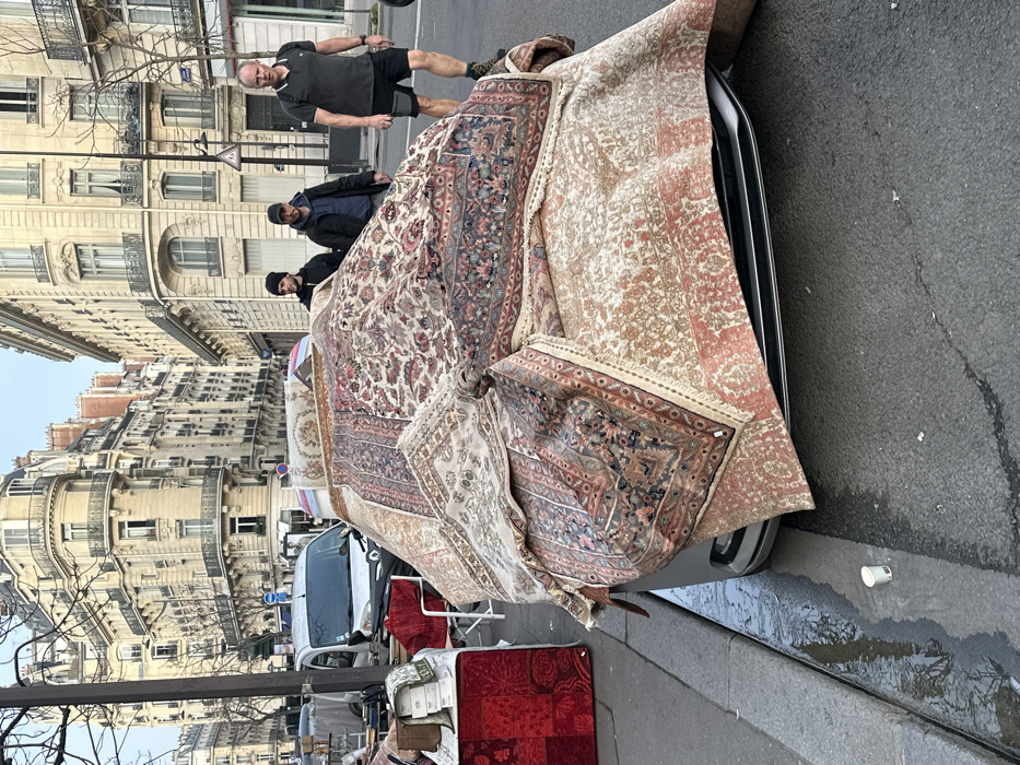 The scene depicts a street in Paris, France, characterized by multi-story Haussmannian apartment buildings with light-colored stone facades and wrought-iron balconies. In the foreground, a light-colored sedan or small SUV is parked curbside, almost completely covered by numerous rolled and folded oriental rugs. These rugs display diverse intricate patterns, predominantly featuring shades of red, blue, beige, and brown, and are draped over the vehicle's hood, roof, and sides, extending onto the asphalt. Adjacent to the car, a shallow puddle of water accumulates along the curb, and a white disposable cup rests on the street. To the left of the vehicle, components of a street market are visible, including a table draped with red patterned fabric, white folding chairs, and stacked boxes. A white utility van is parked further down the street. Three adult males are observed walking away from the viewer on the street to the right of the rug-covered car. The individual on the right wears a dark short-sleeved polo shirt, dark shorts, and dark shoes. The middle individual wears a dark jacket, a blue hooded sweatshirt, and a dark baseball cap. The leftmost individual wears a dark jacket and a dark beanie. The street is asphalt-paved, and bare deciduous trees line the thoroughfare under bright daytime lighting.