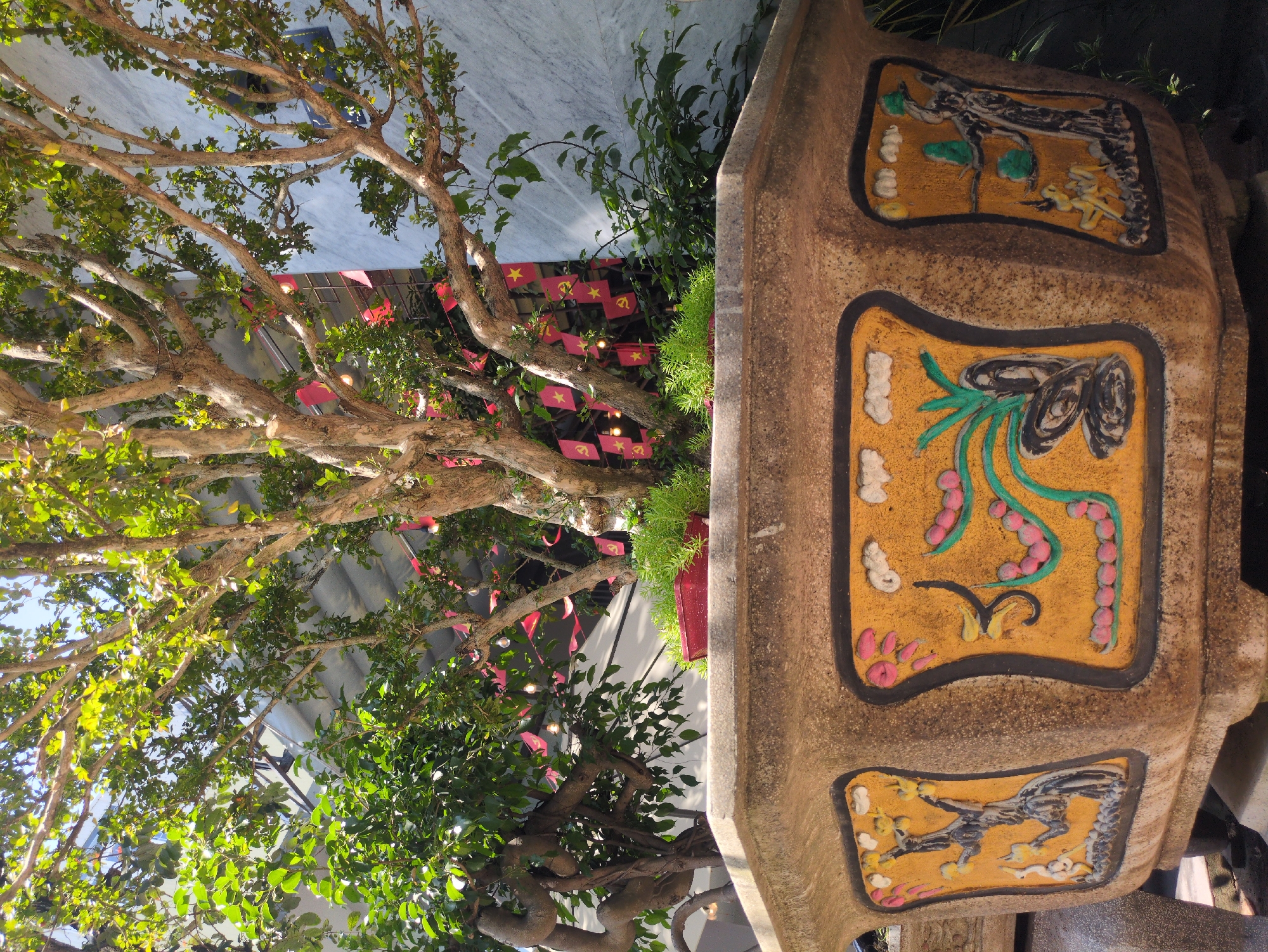 The image depicts a tree decorated with small red flags bearing a gold star and hammer and sickle emblem, set within an ornate concrete planter. The planter features three distinct painted panels, one showing stylized trees and figures, another displaying shell-like objects and a trailing pink bead design, and the bottom panel featuring a dragon. The tree appears to be a street tree with many branches, partially obscured by its leafy canopy. The background reveals a light-colored building façade and other greenery. The location is likely in South Quy Nhon Ward, Vietnam, indicated by the flags.