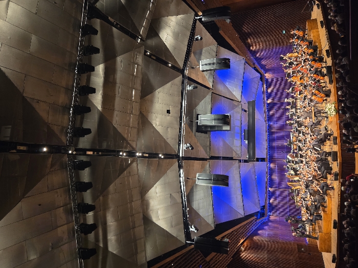 - "An elevated, sideways view shows a concert hall with a triangular, metallic ceiling above an orchestra" by FM-d0RY92, licensed under CC BY 4.0