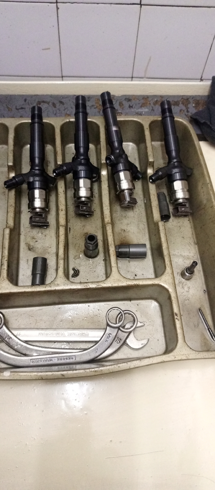Four diesel fuel injectors lie in separate compartments of a dirty, sectioned tray. Disassembled parts, including a nozzle, various fittings, and metal sleeves, are scattered among the injectors. Wrenches are piled in the lower section of the tray, bearing the brand name "GEDORE-VANADIUM." The backdrop features a tiled wall. The arrangement suggests a mechanic's workspace and the ongoing maintenance or repair of the fuel injectors.