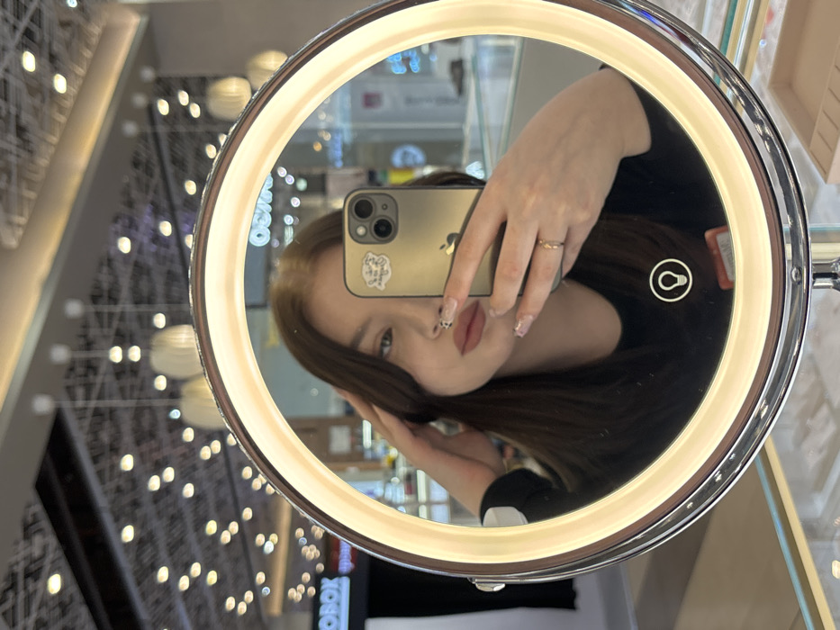 A young adult female is depicted in a mirror selfie, captured within a commercial retail environment in Yekaterinburg, Russia. The primary subject is reflected in a circular, chrome-framed vanity mirror, which features an active, illuminated LED light ring and a touch-sensitive light icon on its surface. She has long, dark brown hair, light-colored eyes, and wears light-colored lipstick. Her fingernails are manicured with a clear base and distinct black and white patterns. She is wearing a dark, long-sleeved garment. The subject is holding a gold-colored Apple iPhone (identifiable by its three-lens camera array and back sticker) in her right hand, pointing it towards herself to capture the mirror reflection. Her left hand is raised, with fingers positioned near her left temple, touching her hair. Her lips are slightly pursed. The background, visible as a reflection in the mirror, shows a brightly lit indoor commercial space, likely a shopping center. Visible store signage reflections include "OBOX", "ОПТИКА" (Optics), and "ЧАСЫ" (Watches), indicating a jewelry, optical, or watch store. The ceiling features a patterned surface with numerous small, recessed lights and several larger, dome-shaped hanging light fixtures. In the unreflected foreground, a clear glass display case is partially visible, suggesting a retail counter.