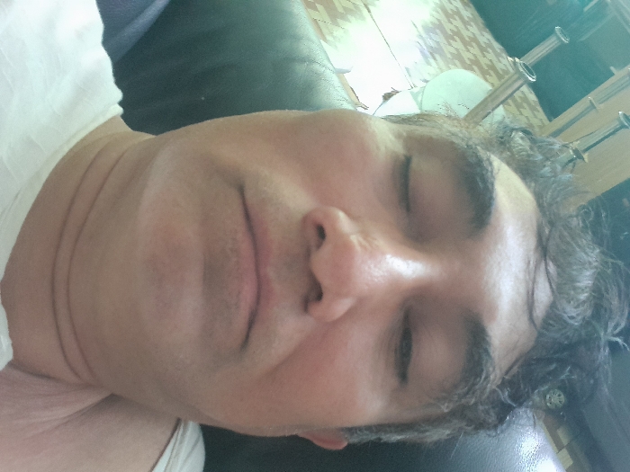 close-up of a man's face, shot from a slightly upward angle. His eyes are closed and he appears to be sleeping or resting. He has short, dark hair that is slightly disheveled. He is wearing a plain white shirt. He is seated on a black leather chair. The background shows a partially visible floor with a checkered pattern, which is likely inside a home or business located in Yangon, Myanmar (Burma), at the coordinates provided (latitude: 16.82, longitude: 96.124). The image is likely captured with a mobile phone and the lighting is slightly dim. There are no other people present.