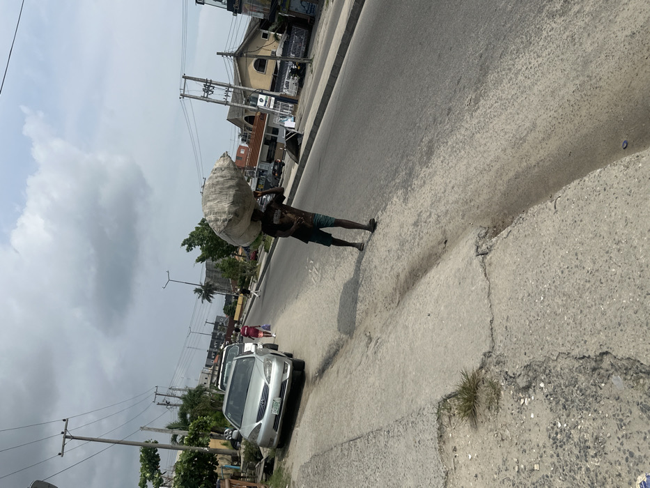 This image depicts a daytime urban street scene in Ado, Nigeria. In the mid-ground, a dark-skinned male individual, wearing a dark t-shirt, dark shorts, and dark flip-flops, walks on the asphalt road. He carries a large, light-colored, irregularly shaped sack on his head. His shadow is visible on the road surface to his right. To the left of the road, a concrete curb separates it from an uneven concrete sidewalk, which features a shallow drainage channel. A silver Toyota Camry sedan (license plate "LAGOS M-400...") is parked on the sidewalk, facing away from the viewer. A second white vehicle is partially visible behind it. Overhead, utility poles support numerous electrical lines. Further down the sidewalk, two additional pedestrians are visible, one wearing a red top. The background shows a thoroughfare lined with various commercial and residential buildings, some with multiple stories and visible signage. Additional utility poles, streetlights, and green foliage, including palm trees, are present. Vehicles are discernible on the road in the distance. The sky is partially cloudy with large, diffused grey and white clouds.