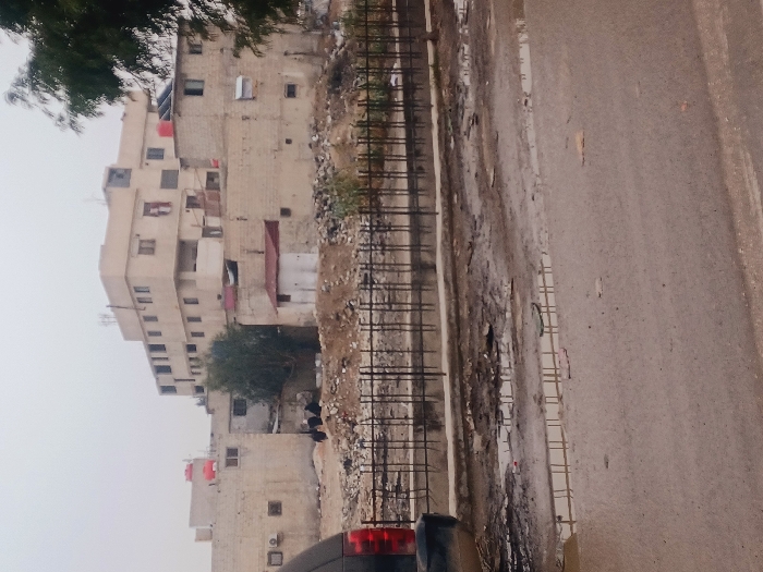 The image depicts an urban street scene in Kafr Sousa Municipality, Syria, under an overcast sky. In the immediate foreground, a dark-colored vehicle, possibly an SUV, is partially visible on the far left, showing its rear bumper and a portion of its left taillight and fender. The paved road surface directly in front of the viewer is damp and dirty, featuring numerous shallow puddles that reflect elements from the midground. Debris and mud are scattered across the asphalt. The midground features an exposed construction or demolition site. A substantial rebar framework, consisting of vertical and horizontal steel rods, forms a linear structure running horizontally across the frame, likely a foundation or retaining wall. Behind this rebar, the ground is uneven and covered with a mixture of dirt, rubble, and construction waste. To the left of the center, three individuals dressed in dark clothing are visible on the cleared ground, appearing to be standing or seated amidst the debris. A small, leafy tree grows from the ground behind the rebar structure. In the background, multiple light-colored, block-built residential or commercial buildings are visible. On the far left, a lower structure with an external air conditioning unit and a red water tank on its roof is present. Dominating the center-right background is a multi-story building, approximately four to five stories high, with numerous rectangular windows and some simple balconies where clothes are visible hanging. A red water tank and what appear to be solar panels are situated on the roof of a smaller building adjacent to the taller structure on the right. Additional utility elements, such as antennas, are present on the rooftops. Patches of dark green foliage from trees are visible on the far right, partially framing the upper right corner of the scene. The lighting is diffuse due to the uniformly grey, overcast sky, resulting in soft shadows.
