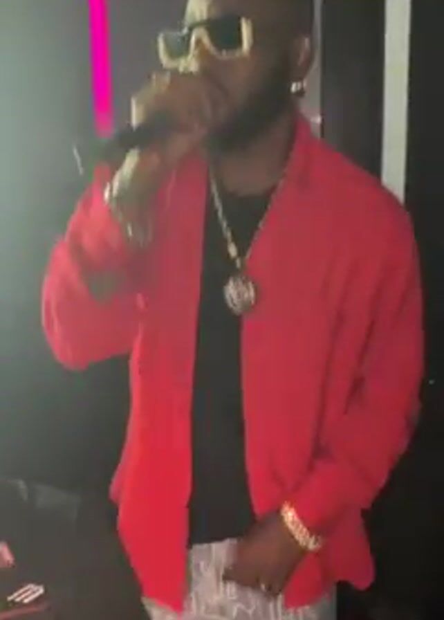 A man is seen singing into a microphone in a nightclub setting. He is wearing sunglasses, a red shirt, a black t-shirt, and grey patterned pants. He is also wearing a large gold ring and several gold chains and bracelets. Someone is filming him with a cell phone. The room has dark walls, a few vertical pink and white light fixtures, and is generally dim.