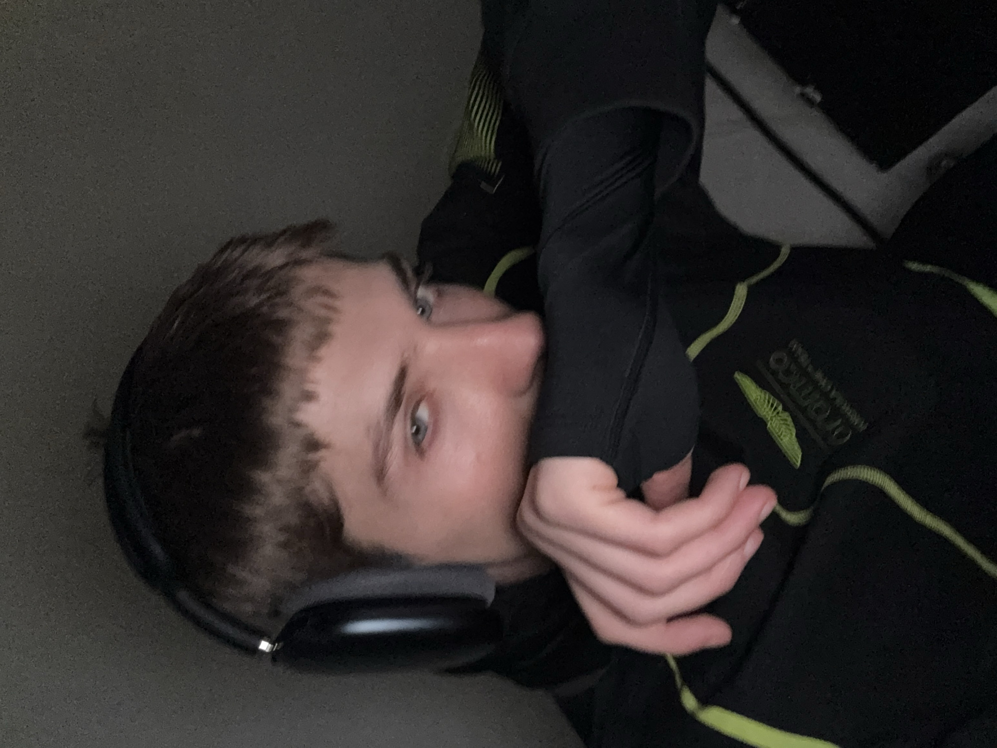 The scene depicts a young Caucasian male located in an unidentifiable indoor setting within Cologno Monzese, Italy. He has short, light brown hair and blue eyes, which are directed at the camera. The subject is wearing dark over-ear headphones. He is dressed in a dark-colored, long-sleeved garment featuring lime green piping or stripes. A prominent lime green logo, identifiable as the Aston Martin F1 team emblem (stylized winged design), is visible on the left chest area, above the partially legible text "aramco AMERICAS CHEM.INC." The male's left forearm and hand are positioned across the lower portion of his face, obscuring his nose and mouth, with his fingers resting near his right shoulder/upper chest. The background is uniformly dark and indistinct, indicating low light conditions and lack of environmental detail.