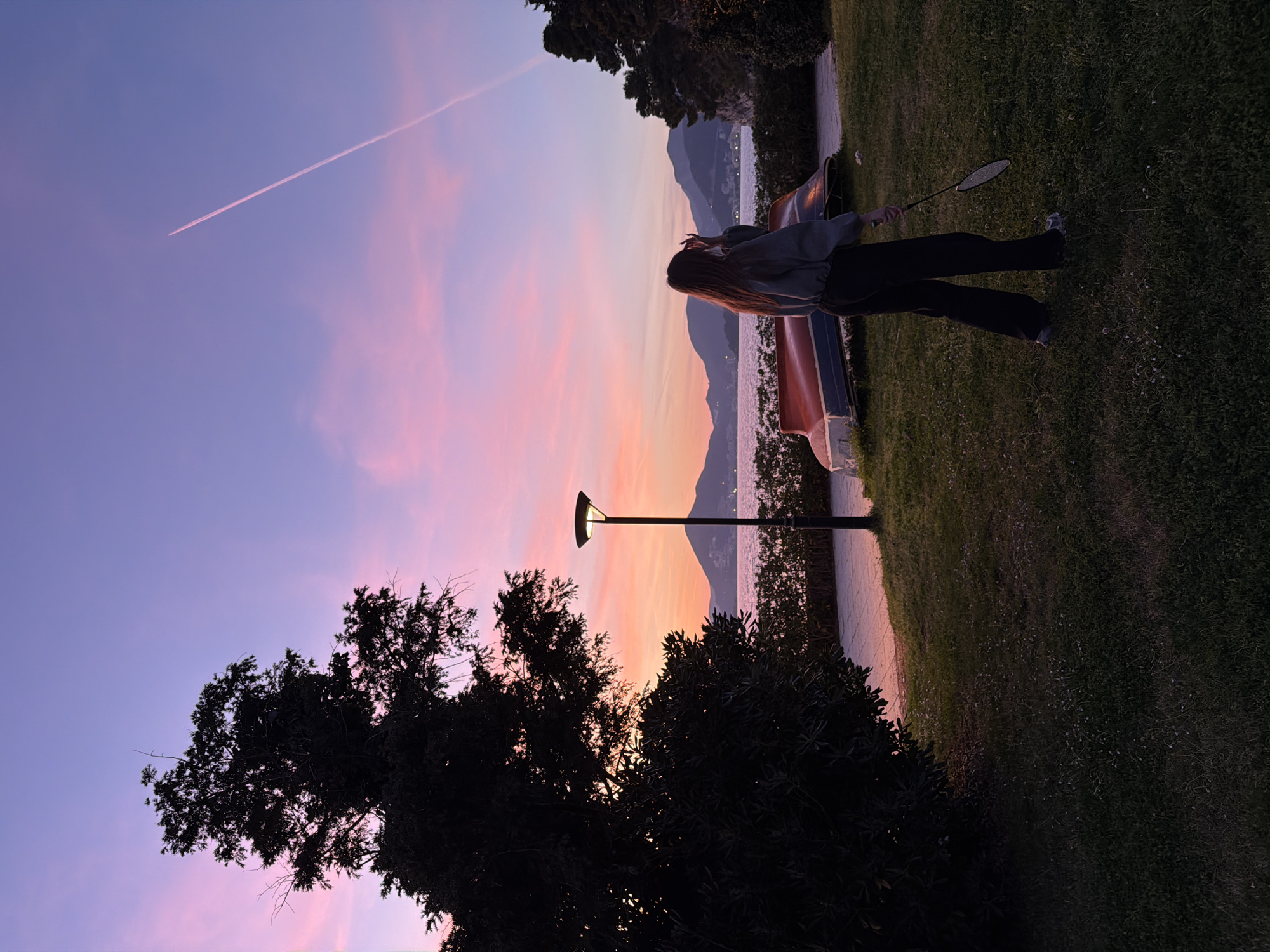 The scene depicts a coastal landscape in Sveti Stefan, Montenegro, during sunset. The sky displays vibrant gradients of purple, pink, and orange, with a faint white contrail from an aircraft extending diagonally across the upper right. Silhouetted mountains line the distant horizon across a body of water, likely the Adriatic Sea, with scattered lights from a settlement visible along the distant shore. In the foreground, a young female individual stands on a grassy area, facing generally towards the sunset and water. She has long, reddish-brown hair and is dressed in a light grey long-sleeved top and dark trousers. She holds a badminton racket in her right hand, pointed downwards. Her left hand is raised near her head, partially obscuring her face. To the left of the individual, a large, dark tree with dense foliage is silhouetted against the colorful sky. A modern black streetlamp with an illuminated cap stands between the tree and the individual, positioned near a paved pathway. Two small boats are overturned on the grass near the pathway, one predominantly red and the other blue. A line of dark green bushes borders the paved path, separating it from the water. The immediate foreground consists of a dark green grassy area with scattered small, light-colored plants.