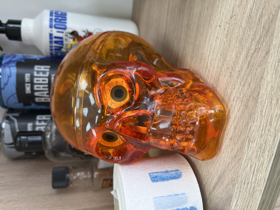 The scene depicts an interior view of a barbershop in Lom, Bulgaria. A translucent amber-orange plastic skull, featuring internally illuminated orange eyes with black pupils and red vein-like patterns, is centrally positioned on a light brown wood-grain laminate shelf. To the immediate left of the skull is a roll of white paper neck strips marked with blue rectangular patterns. In the blurred background, several grooming products are visible: a small clear glass bottle with a black cap, two dark-colored bottles partially labeled "BARBER" and "AFER," and a white pump bottle with a visible "INAL ORIGI" label and a red and black tattoo-style graphic. The shelf surface exhibits minor dust or debris particles.