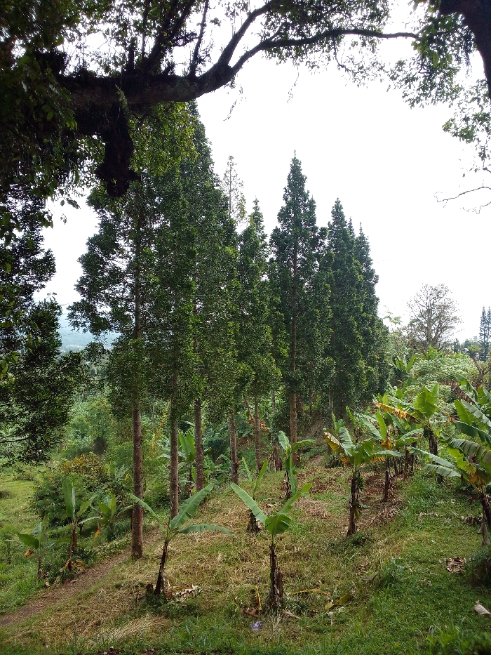 The image depicts a verdant, hilly tropical landscape located in Bogor, Indonesia, viewed under a bright, largely overcast sky. The foreground features a grassy slope ascending from left to right, interspersed with approximately ten young banana plants characterized by large green leaves, alongside areas of exposed brown earth and dry vegetation. A narrow dirt path is visible on the lower left portion of this slope. The midground is dominated by a prominent, linear arrangement of ten to twelve tall, slender evergreen trees with dense, dark green foliage, appearing to be deliberately cultivated. Behind this row, a dense expanse of varied green trees and vegetation extends into the distant background, where the faint outlines of mountains or large hills are discernible against the horizon. Large, dark, gnarled tree branches extend into the upper left and upper right corners of the frame, partially obscuring the sky and acting as natural framing elements. No individuals, animals, or man-made structures are observed within the immediate scene.