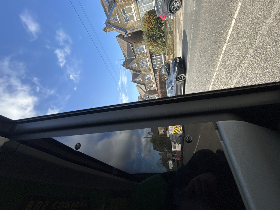 The image captures a daylight street scene from the interior of a vehicle, looking out a side window onto a residential street in Bradford, United Kingdom. The left portion of the frame is occupied by the dark interior trim and a tinted window panel of the observer's vehicle. A circular fixture, possibly a suction cup mount, is visible on the window glass, along with a dark reflection featuring a green, indistinct object. The external environment reveals a two-lane asphalt road with white painted markings, including a solid line adjacent to the central window frame and dashed lines further ahead, consistent with UK road standards. On the right side of the street, a dark grey sedan, likely a BMW, is either parked or moving slowly, facing away from the camera. Beyond it, a dark SUV is parked in front of a row of multi-story, light-colored stone houses with bay windows and pitched roofs, characteristic of Bradford architecture. These residences are fronted by low stone walls and mature hedges. Utility lines are visible against the sky above the houses. On the left side of the street, a line of vehicles is stationary or parked. Prominently featured is a white van displaying distinctive yellow and black diagonal reflective stripes on its rear, indicating a service or utility vehicle. Another white van is visible further down the street. The sky overhead is clear blue with scattered white cumulus clouds, and the scene is illuminated by strong sunlight, casting shadows. No explicit human figures or interactions are clearly discernible, beyond the implied presence of occupants in the vehicles.