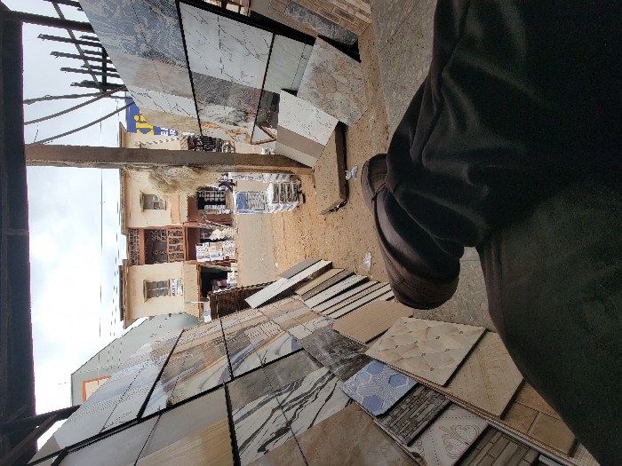 Displayed are various ceramic tiles in shades of beige, grey, and blue with diverse patterns. They are set on a surface leading to a street view with multiple buildings. A partial view of a person wearing dark clothing is prominent in the foreground. The urban scenery includes a building with exposed woodwork and signage. Overhead, a fragmented framework structure is visible against a cloudy sky.
