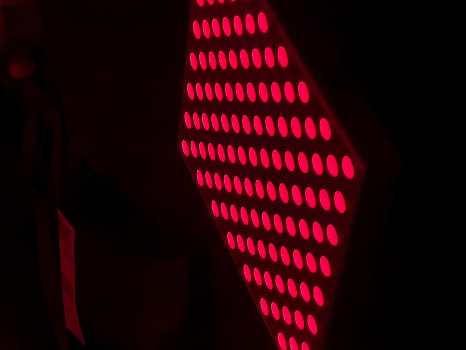 A dimly lit image features a rhombus-shaped object filled with evenly spaced, glowing red dots. The illumination casts a faint red glow on the nearby surfaces, with a contrasting dark backdrop that highlights the vibrant pattern. To the left is a barely perceptible band or ribbon.