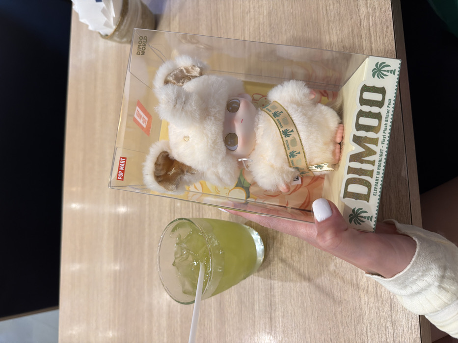 The image depicts an indoor scene on a light brown, wooden-grained table. A fair-skinned hand with white-painted nails, wearing a light-colored long-sleeve garment, holds a clear plastic box containing a "DIMOO WORLD" plush toy. The plush toy is cream-colored and fluffy, featuring large, round, dark eyes, a small nose, and a fuzzy hat with light brown-lined ears. It wears a gold-colored band across its chest with green palm tree and "DIMOO" motifs. The box is labeled "POP MART" and states "ELEPHANT IN MOONLIGHT - Vinyl Plush Blister Pack" on its base. To the left of the box, a clear glass filled with a green liquid and ice cubes contains a white plastic straw. In the blurred background, a small woven basket is partially visible. The scene is consistent with a commercial establishment, such as a cafe or retail area, located in Wichit, Thailand.