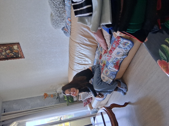 This image depicts an indoor residential living space, identified as a living room, in the city of Unknown, Unknown. A young adult female, with long dark brown hair, is seated on a light brown sofa, which is partially covered by a multi-colored patchwork quilt. She wears a black long-sleeved top, light blue jeans, and light blue slippers. Her right elbow rests on her right thigh, with her right hand supporting her chin, while her left hand holds a dark-colored smartphone on her left thigh. She is looking towards the camera with a subtle smile. To the left of the subject, a large glass door, likely leading to a balcony or patio, is visible, admitting bright natural light and revealing green foliage outside. White curtains are drawn back from this door. A round, polished wooden coffee table with ornate legs is partially visible in the left foreground. Above the sofa, on a textured off-white wall, a framed picture depicting a vase with flowers is hung. In the bottom right foreground, a dark table with a floral pattern supports a stack of folded clothing, including items of grey, white, black, blue, green, and red. The floor throughout the visible area is a light-colored laminate or wood. A decorative artificial plant with orange flowers is situated between the sofa and the balcony door.