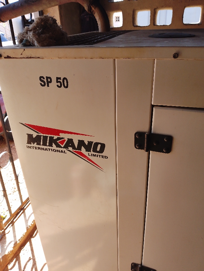 The image displays a close-up view of an off-white industrial generator, positioned outdoors in the city of Jos, Nigeria. The front panel of the generator is marked with "SP 50" in black lettering near the top left. Below this, the "MIKANO INTERNATIONAL LIMITED" logo is visible, featuring a stylized black 'M' with red triangular accents. The generator's right side features two vertical cabinet doors secured by two visible black metal hinges. The top surface of the generator is discolored, possibly with rust, and has a metal grate on its left side. A crumpled, fibrous, light brown material, resembling a dirty rag or insulation, rests on this grate. A curved, dark metal pipe or conduit passes above the generator from the upper left. In the blurred background, to the left of the generator, a dark metal fence or railing structure is partially visible. The ground beyond appears reddish-brown. To the right and behind the generator, a light-colored building wall is present, featuring several distinct square cutouts or openings, and a smaller, framed window further in the distance. No individuals, explicit actions, or direct interactions are depicted.