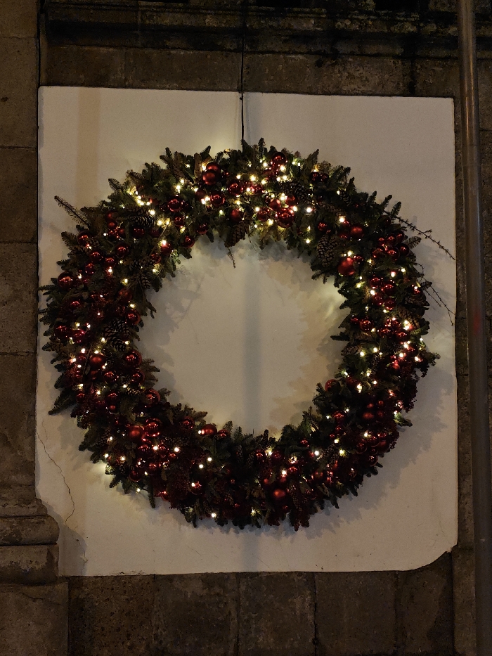 - "A large Christmas wreath hangs on a white rectangular surface against a stone wall" by FM-Dyz9F3, licensed under CC BY 4.0