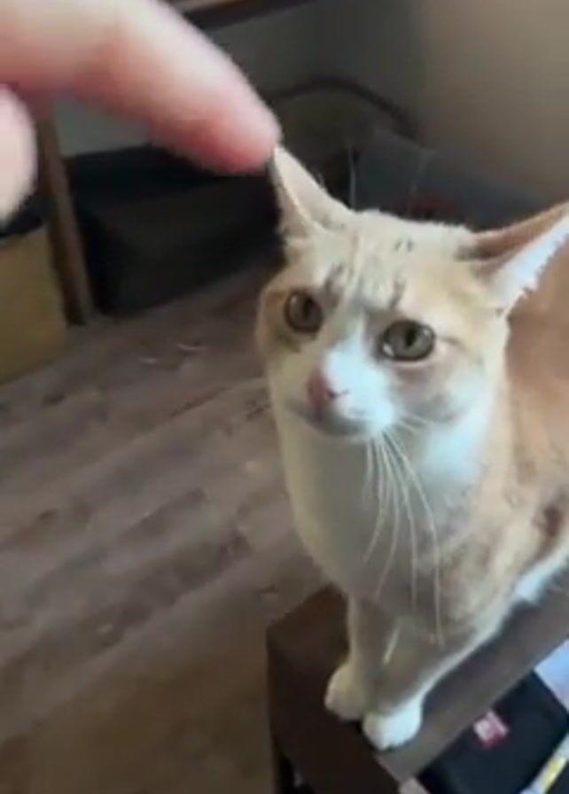 - "A person's finger points towards the head of a mostly orange cat with white markings, standing on a small wooden table" by FM-xTDQG2, licensed under CC BY 4.0