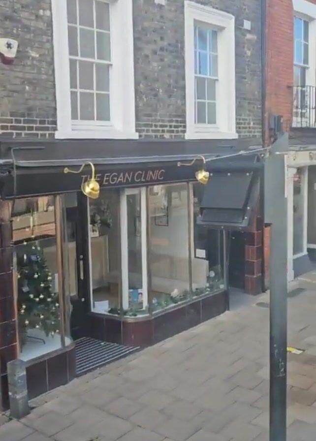 The camera pans across a street with shops on both sides, showcasing a variety of businesses. Initially, a group of people are gathered outside "The Egan Clinic," a storefront with large windows and a Christmas tree visible inside. As the camera moves, it passes a bus stop with advertisements and a shelter, then focuses on "Little Peek Baby Ultrasound" and "Sweet Land American Candy." An elderly woman wearing a black coat and carrying a bag is seen walking past the bus stop, moving away from the camera. The buildings are predominantly brick, and the overall setting appears to be a quaint urban street.
