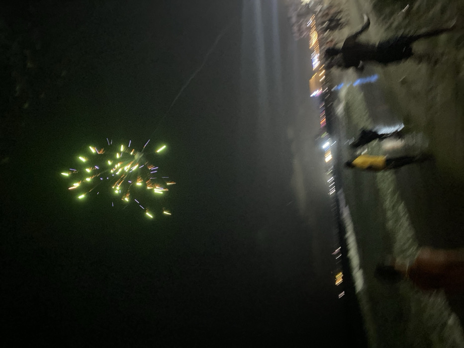 A night shot shows a fireworks display illuminating the dark sky. The burst is a cluster of green and gold sparks. To the right, a blurry scene unfolds along a shoreline. People, represented by indistinct forms, are present. Lights from buildings or streetlamps create reflections along the water's edge. The image is partially obscured by motion blur.