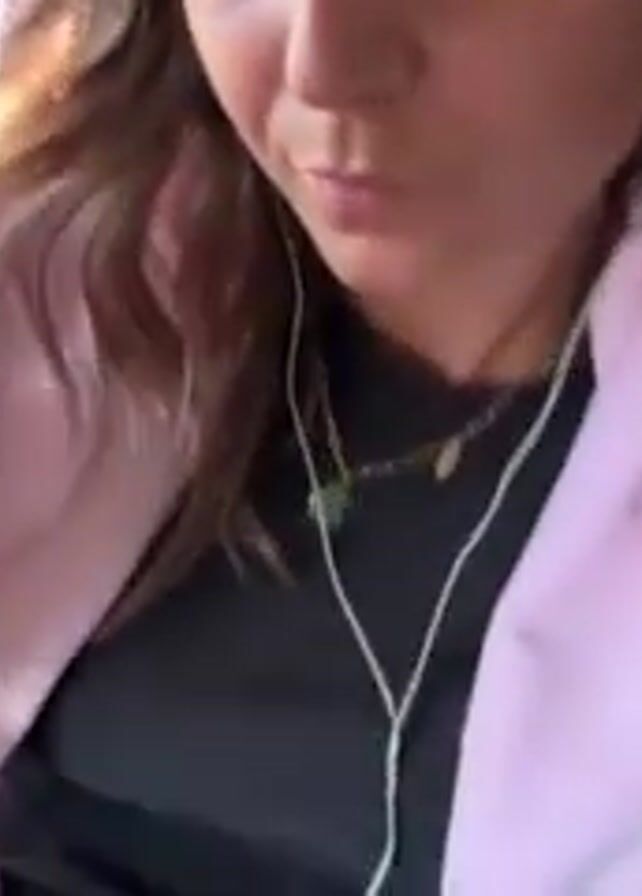 A woman with brown hair is sitting in a seat, likely on a plane. She's wearing a black t-shirt, a pink hoodie draped over her shoulders, and what appears to be black leggings. She has wired earbuds in her ears and is wearing a necklace. A small black bag is secured around her waist. The seat appears to be black leather with red accents. The lighting is slightly bright and potentially from a window. The woman is looking directly at the camera.