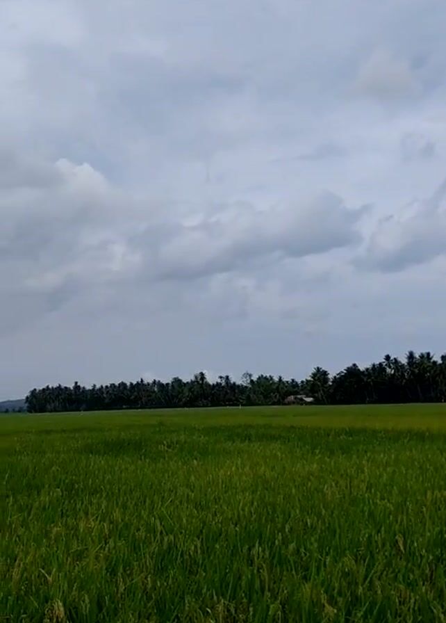 scenic view of a lush green rice field under a cloudy sky. The rice plants fill the entire foreground, swaying gently in what may be a light breeze. In the distance, a line of tall trees, possibly palm or coconut trees, marks the horizon. The sky is overcast with thick grey clouds, creating a soft, diffused light over the landscape. The overall impression is of a serene, rural scene, possibly filmed in a tropical or subtropical region.