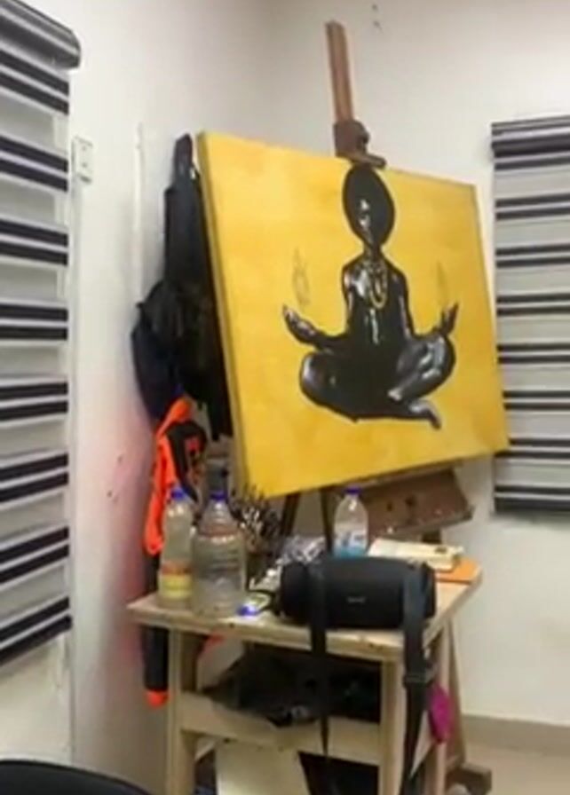 The video presents a small art studio, showing two completed and in-progress paintings on easels. The first painting depicts a figure with an Afro in a seated, meditative pose against a yellow background, with flame-like shapes emerging from the hands. It is on a wooden table cluttered with supplies, bottles of water, and a speaker. The studio is white with black and white striped blinds. The second painting, still in progress, shows a woman with a white Afro wig and beaded necklace against a yellow background. A chair and a second easel with supplies are visible. The camera slowly pans from one painting to the other.