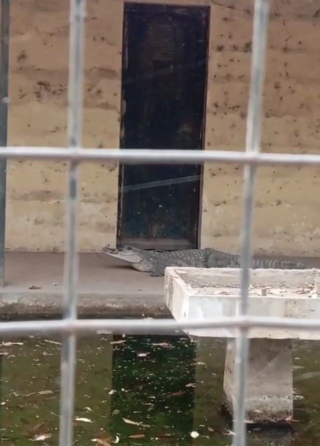 crocodile lying on a concrete surface, viewed through a metal cage. Behind the crocodile is a wall with a black door. In front of the crocodile is a small, white concrete structure, possibly a feeding platform. In the foreground, the camera's focus shifts to a body of water covered in debris, partially reflecting the scene above. The crocodile is stationary, appearing to be resting.