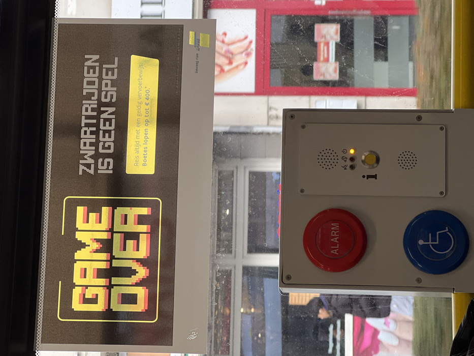 The image depicts the interior of a public transport vehicle, likely a tram or bus, looking outward onto a city street in Antwerp, Belgium. Dominating the top of the frame is a rectangular advertisement with a dark grey background. On its left, the pixelated yellow and orange text "GAME OVER" is prominently displayed. To the right, white pixelated text reads "ZWARTRIJDEN IS GEEN SPEL" (Dutch for "Riding without a ticket is no game"). Below this, a yellow banner states, "Reis altijd met een geldig vervoerbewijs. Boetes lopen op tot € 400." (Dutch for "Always travel with a valid transport ticket. Fines can go up to € 400."). The "De Lijn" public transport logo is visible in the bottom right corner of the advertisement. Below the advertisement, a light-colored control panel is mounted on the vehicle's interior wall. It features a large red circular button labeled "ALARM" on the top left. Directly below it is a blue circular button with the international wheelchair accessibility symbol. To the right of these buttons, a rectangular panel contains two speaker grilles (top and bottom), an "i" symbol above a circular yellow button which is illuminated, and two small indicator lights above the "i" button, with the rightmost one glowing yellow. Through the window, a blurred street scene is visible. The window glass shows evidence of water droplets or dirt. On the right side of the street, a shop with a distinctive red door and red window frames displays faint imagery of hands with painted nails, suggesting a salon. A street number "27" is faintly discernible above the red door. On the left side of the street, another building with large, reflective windows can be seen. A single individual, dressed in a dark jacket, is partially visible walking on the sidewalk on the left. The overall lighting suggests an overcast day.