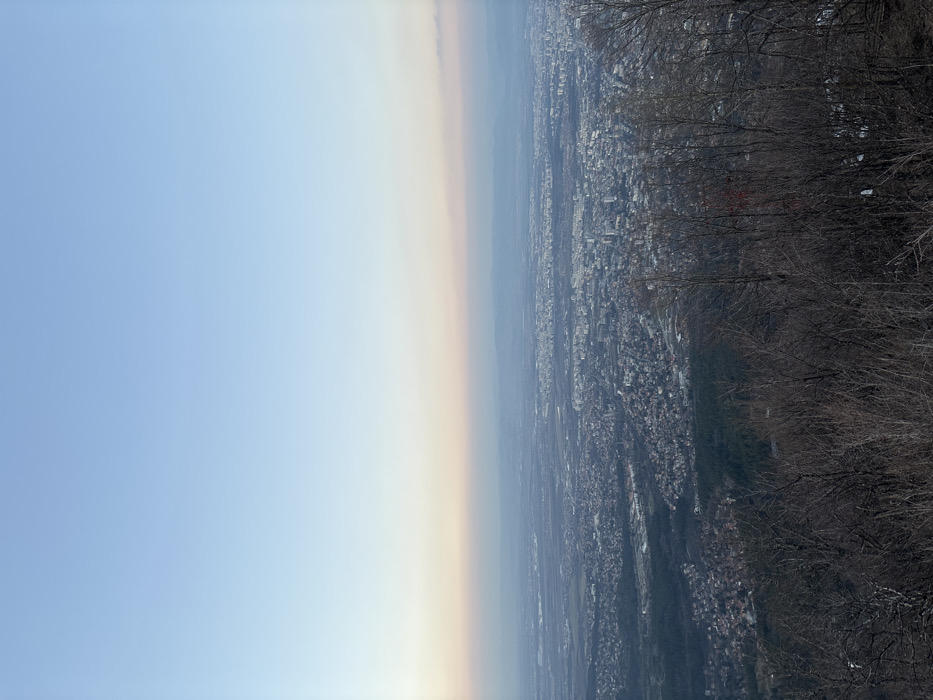 This image presents an elevated panoramic view of the city of Sofia, Bulgaria, observed from a slope of Vitosha Mountain, looking generally north-northeast. The upper third of the frame shows a clear sky with a subtle vertical color gradient, transitioning from a light blue at the zenith to a pale pinkish-orange and then a hazy light grey-blue near the distant horizon, suggesting either dawn or dusk. The middle ground is dominated by the sprawling urban landscape of Sofia, consisting of densely packed buildings and infrastructure that extend horizontally across the frame and recede into a atmospheric haze. Beyond the city, the terrain appears relatively flat, with distant, low-lying hills or mountains visible on the far horizon. The lower portion of the image features the dark, intricate silhouettes of numerous bare deciduous trees, indicating a dormant season, on a downward slope. A distinct dark green area of evergreen forest is visible on the lower slopes below the nearest urban edge on the left side of the frame. No individuals, specific actions, or interactions are discernible within the scene.