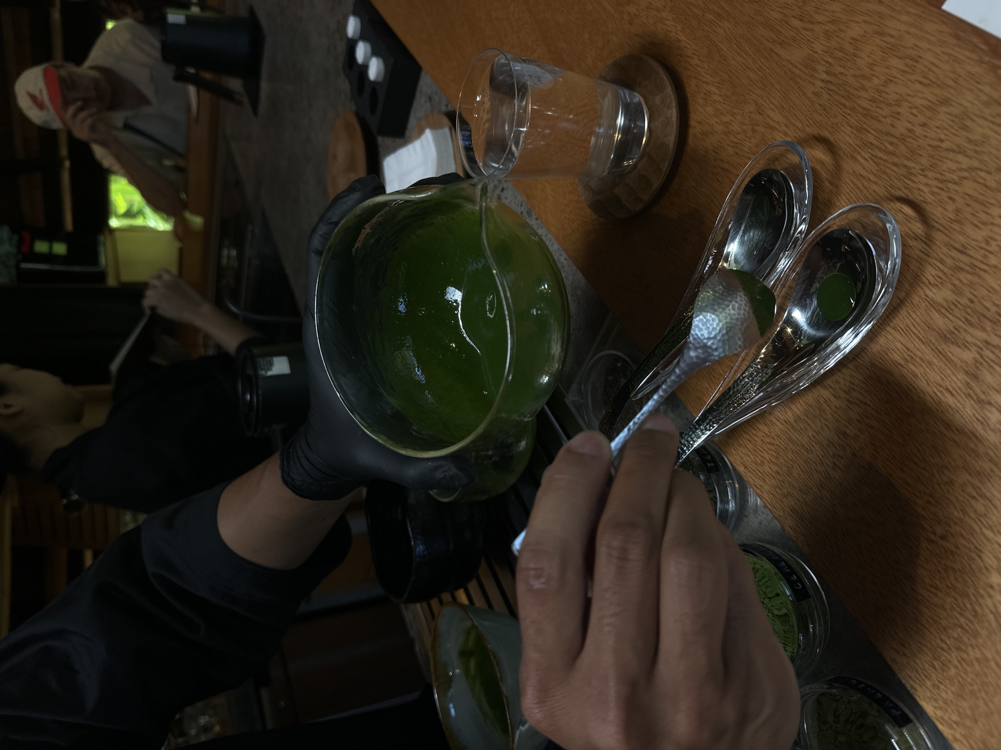 A person wearing black gloves pours a green liquid, possibly matcha, from a glass pitcher with a spout into a set of clear spoons