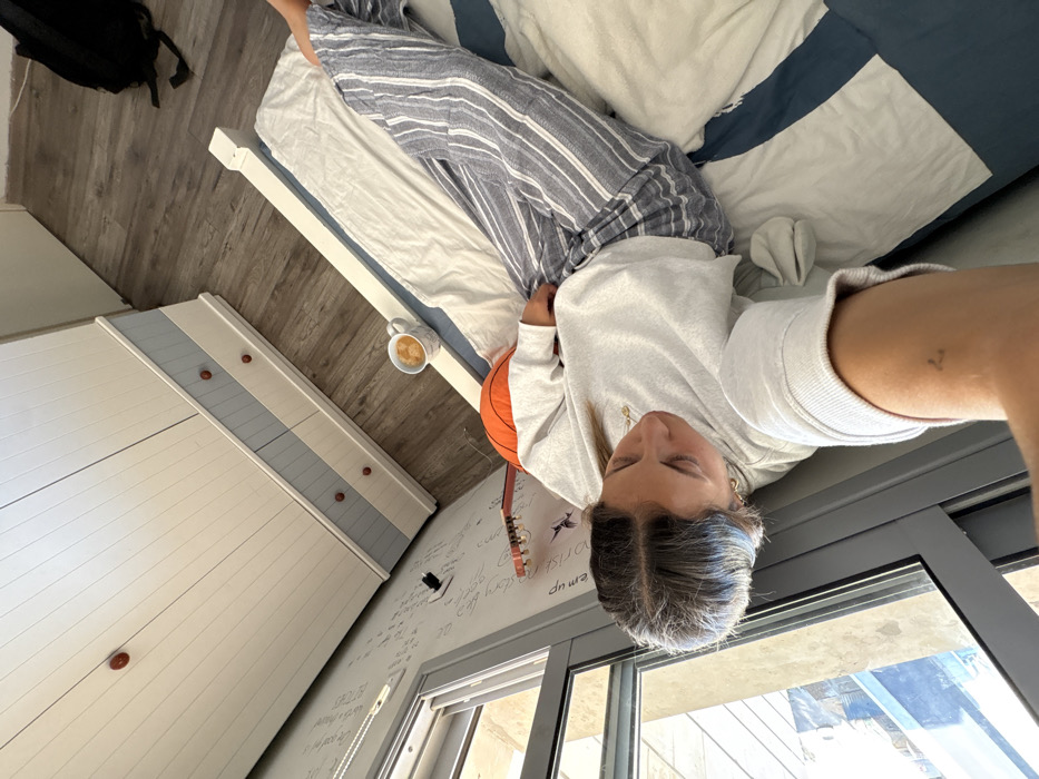 An indoor scene, located in Rishon LeZion, Israel, depicts a young adult female lying on a bed. She wears a light grey long-sleeved sweatshirt and blue-and-white striped wide-leg pants. Her brown hair has prominent blue streaks near the front, and a small tattoo is visible on her inner right forearm. The bed is covered with a white and dark blue patterned duvet. A white mug containing a beverage with two small round items floating in it rests on the white bed frame near her torso. An orange basketball is positioned on the bed between her left side and the mug. A large grey-framed window is to her left, revealing a partial exterior view of a building. The white wall behind her head is covered with handwritten text. A light-colored wooden wardrobe with vertical paneling, white and light blue sections, and brown circular knobs is positioned along the far wall. The floor is wood-look laminate. A black backpack lies on the floor near the foot of the bed. Her right arm is extended towards the camera, consistent with a selfie perspective.