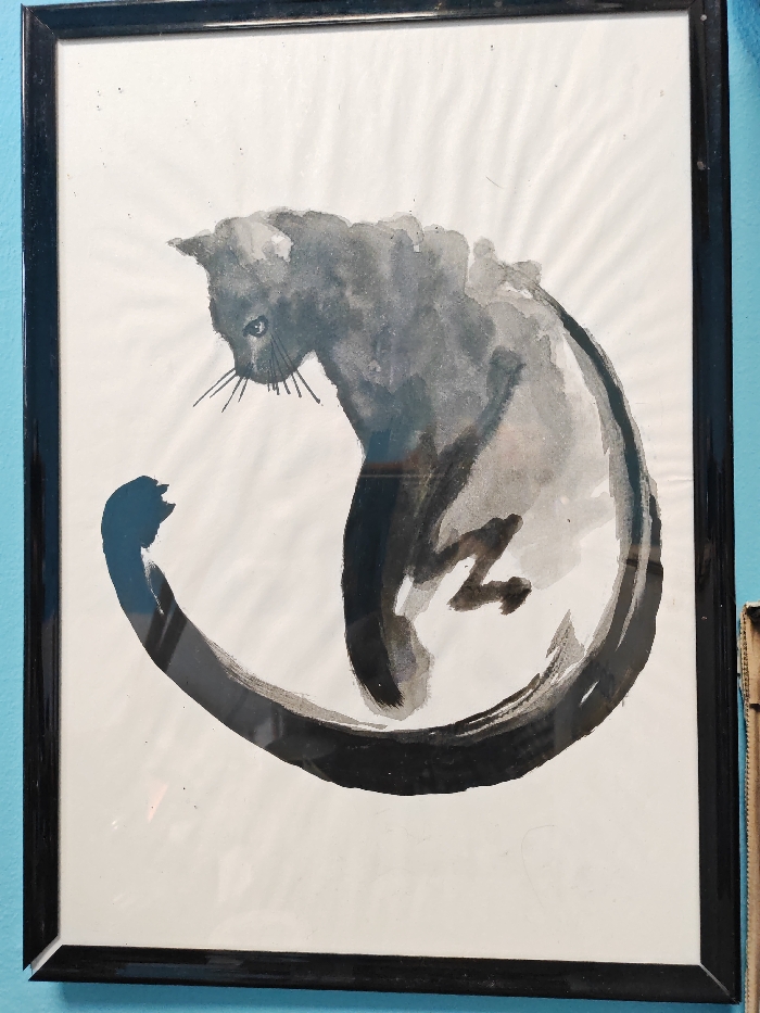 A framed piece of artwork is depicted, presented vertically against a light blue or teal wall. The artwork itself is a calligraphic-style illustration of a cat rendered in black and varying shades of gray ink or watercolor on a white paper background. The cat is shown in a curled posture, with its head positioned in the upper left portion of the image, looking downwards and to the left. It features an observable eye and multiple thin, dark whiskers. The cat's body transitions into a broad, sweeping tail that forms a significant, curved element extending around the lower and right sides of the composition. The artwork is enclosed within a rectangular black frame, which exhibits minor reflections on its glass surface, indicating ambient light sources. The surrounding environment consists solely of the uniformly painted wall. The precise location within the city of Sofia, Bulgaria, is not discernible from the visual information provided in the image.